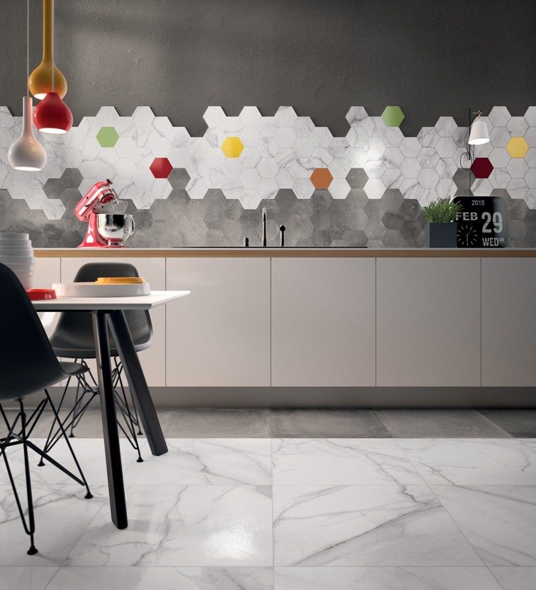 Популярный сегодня стиль лофт дошел и до кухонь. Соединив серый цвет с яркими деталями, можно получить вполне стильный интерьер. Посмотри, как эффектно выглядит плитка в виде сот на бетонной стене и как выигрышно на ее фоне смотрятся цветные светильники.