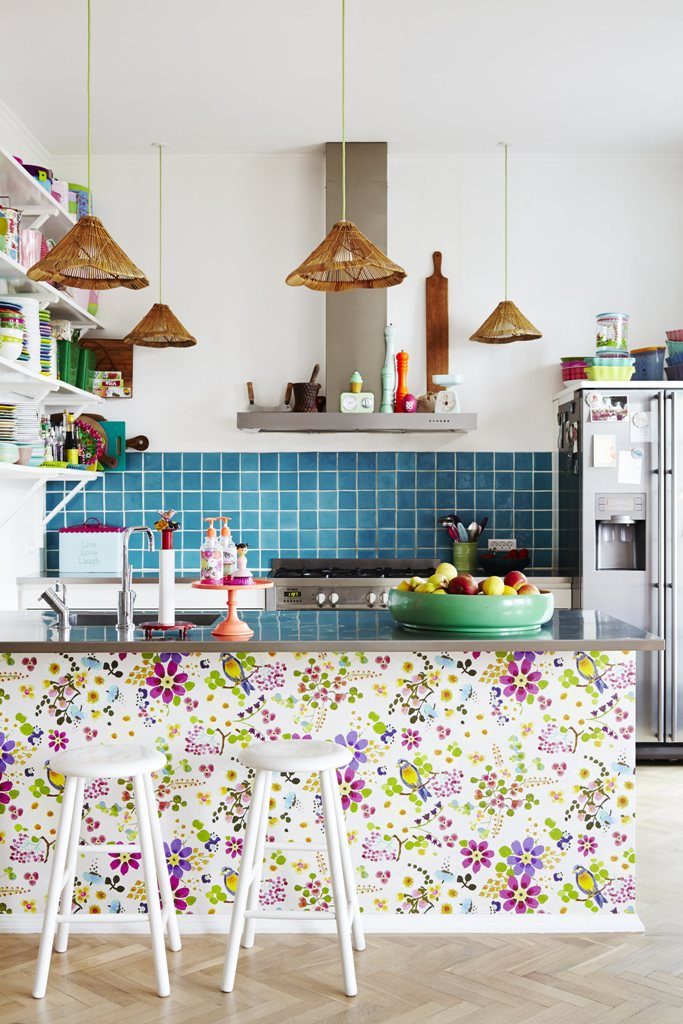 Если ты жизнерадостный человек, тогда тебе точно понравится стиль фьюжн. У него веселый нрав, поэтому интерьер, оформленный в таком стиле, часто декорируют яркими деталями и цветными аксессуарами. Ну а главная изюминка этой кухни – островок, украшенный колоритными обоями.