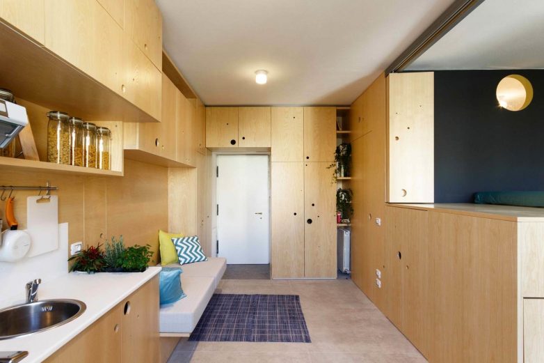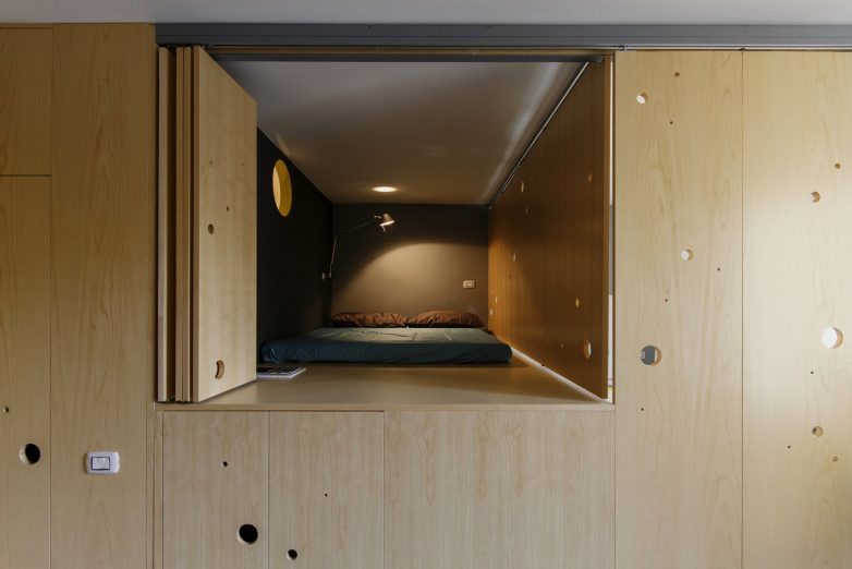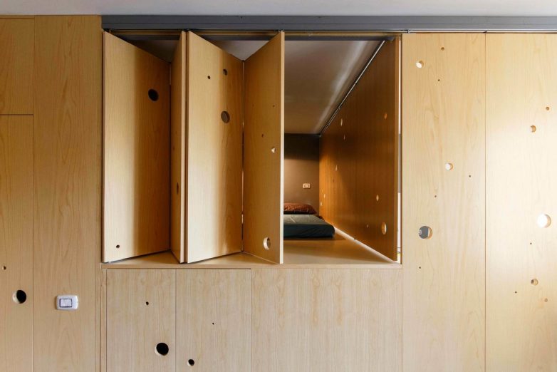 Площадь квартиры составляет всего 34 квадратных метра, а оригинальная планировка была вполне себе типовая и заурядная: прихожая, гостиная с кухней, ванная и спальное место. Архитекторы создали гибкое пространство за счёт использования подвижных перегородок, предлагающих различные комбинации функциональных зон. Акцент сделали на системах хранения, чтобы многочисленные бытовые предметы не перегружали интерьер.