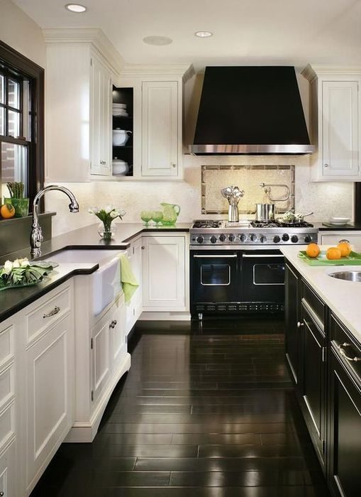 Чтобы блюда получались особенно вкусными на кухне должна царить настоящая гармония. Добиться её поможет чёрно-белая гамма, которая так напоминает шахматное поле. Такое цветовое сочетание отлично смотрится в любом стиле, а особенно подчёркивает элегантность классического направления.