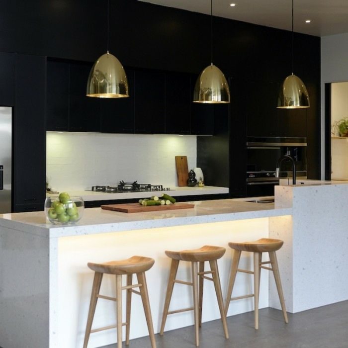 Разбавить монохромную цветовую гамму можно при помощи аксессуаров, если в этом есть необходимость. Например, установить над зоной столовой или кухонным островом ряд металлических светильников, которые будут здорово выделяться на чёрно-белом фоне.