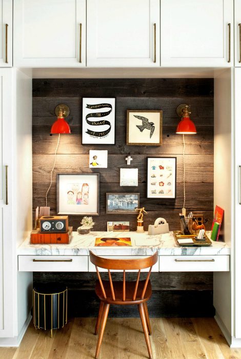Любую пустующую нишу или свободный угол в квартире можно использовать для обустройства рабочего места. Компактный стол-полка, удобный стульчик и пробковая подложка, наклеенная на стену, обеспечит вас уютным пространством для работы, учебы или занятий творчеством.10. Контрастное сочетание