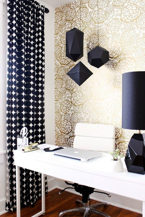 Геометрические светильники, белоснежный рабочий стол с глянцевой поверхностью, комфортабельное кожаное кресло на фоне светлых обоев с золотым орнаментом — потрясающая идея дизайна кабинета в современном доме.