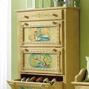 Преобразить современную тумбу для обуви в тумбу стиля Прованс можно добавив плетенные корзины вместо части ящиков. Такая тумба будет хорошо смотреться в загородном доме.