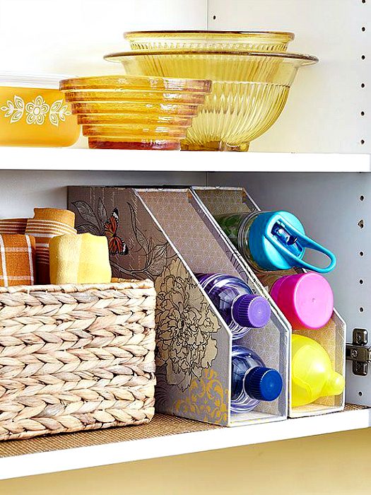 Бутылки с водой, напитками и подсолнечным маслом будут занимать намного меньше места, если хранить их не вертикально, а горизонтально в подставке для журналов. Кстати, такая подставка подойдет и для компактного хранения банок с консервами.