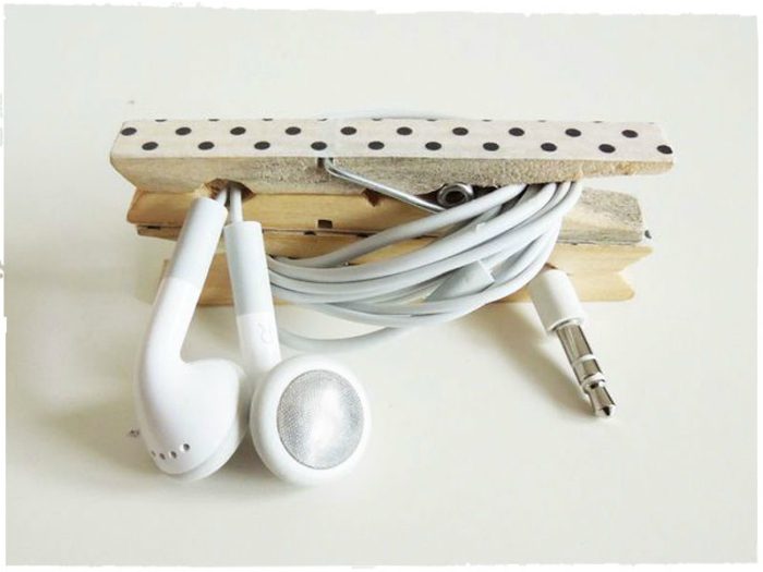 Наушники имеют свойство постоянно спутываться и рваться. Чтобы избежать поломок и продлить жизнь любимым наушникам, относиться к ним нужно бережно, а хранить аккуратно. Некое подобие катушки можно смастерить из двух бельевых прищепок, склеенных между собой. Такой держатель можно носить с собой в сумочке или использовать дома.