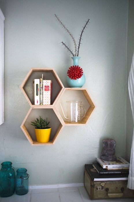 Удачное преображение комнаты возможно при использовании интересных полок-сот.