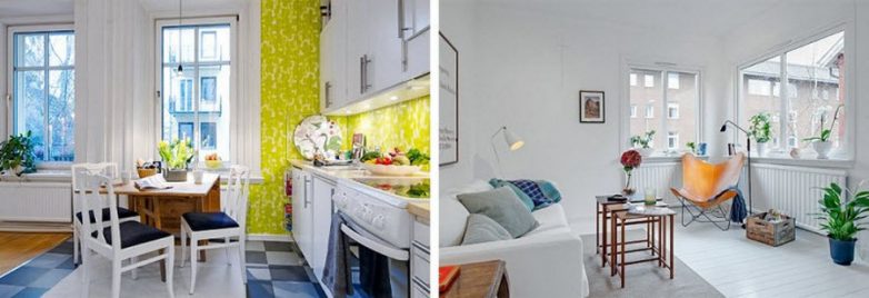 Ну и конечно же, всему миру известный шведский интерьер. Вот комнаты в типично скандинавском стиле: белые стены, белая мебель, яркие акценты в оформлении, огромные окна и отсутствие штор.