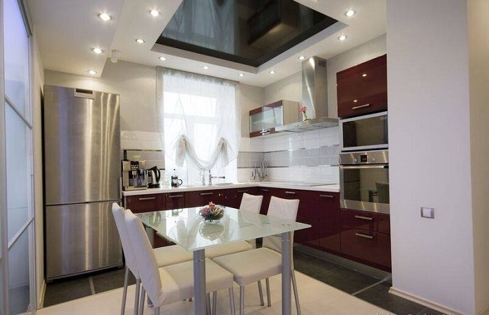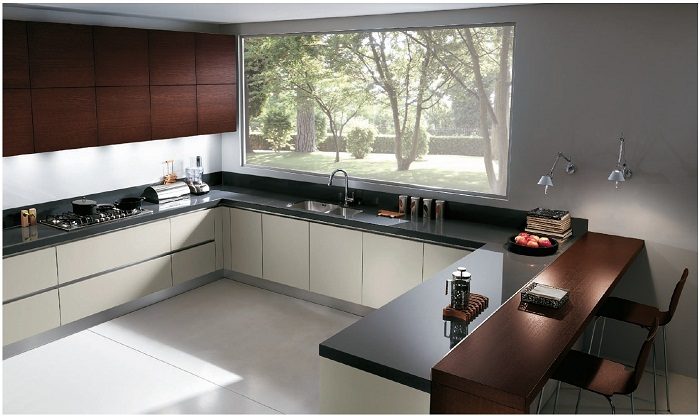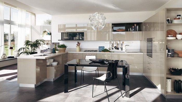 Оформление кухни в светлых оттенках с добавлением черных вставок, что станет просто находкой в декорировании интерьера кухни.