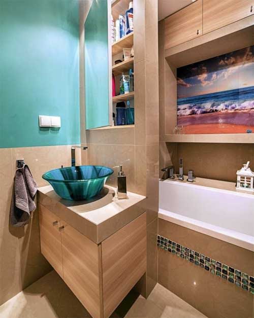 За счет того, что в дизайне этой ванной комнаты гармонично использованы два природных оттенка — светло-коричневый и ярко-бирюзовый, а всевозможные мелкие предметы спрятаны в шкафчиках и на полочках, интерьер смотрится стилистически согласованным и законченным.