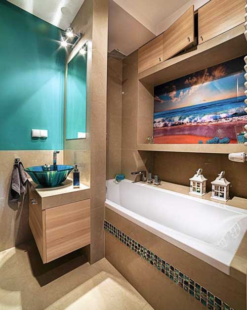 Этим яркими акцентами в дизайне являются красивая стеклянная бирюзовая раковина и стеклянная панель с фотопечатью в бирюзовых тонах над ванной. Именно эта стеклопанель служит камертоном для всех цветовых оттенков в интерьере, гармонично объединяя их и придавая глубокий смысл.