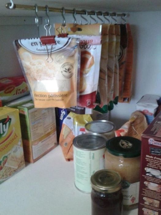 Привычно видеть рейлинг, установленный в рабочей зоне на кухне либо около мойки. Но вот совсем нестандартно смотрится такое приспособление внутри кухонного шкафчика. А ведь благодаря такой задумке в нём будет очень легко навести порядки! Это позволит хранить многочисленные пакетики с приправами и пряностями в подвешенном состоянии. Нижняя часть шкафчика освободится, и туда также можно будет что-то складывать.