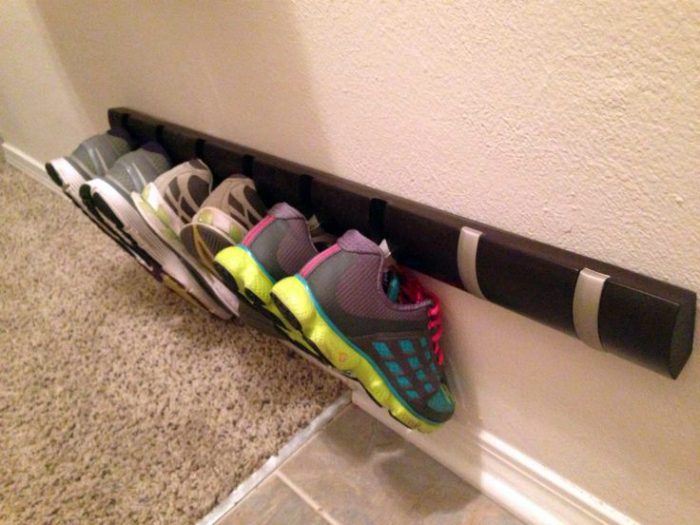 Обычную вешалку для одежды можно использовать и для хранения обуви, просто повесив ее на стене чуть выше пола. Такая идея позволит навести порядок в прихожей и организовать удобное хранения повседневной обуви.