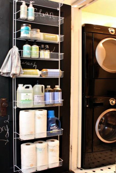 Дверное полотно кладовки можно оборудовать легкими навесными полками для хранения бытовой химии, гигиенических и косметических средств, а также запасов продовольствие. Такая хитрость позволит навести порядок и значительно увеличить вместительность кладовой.