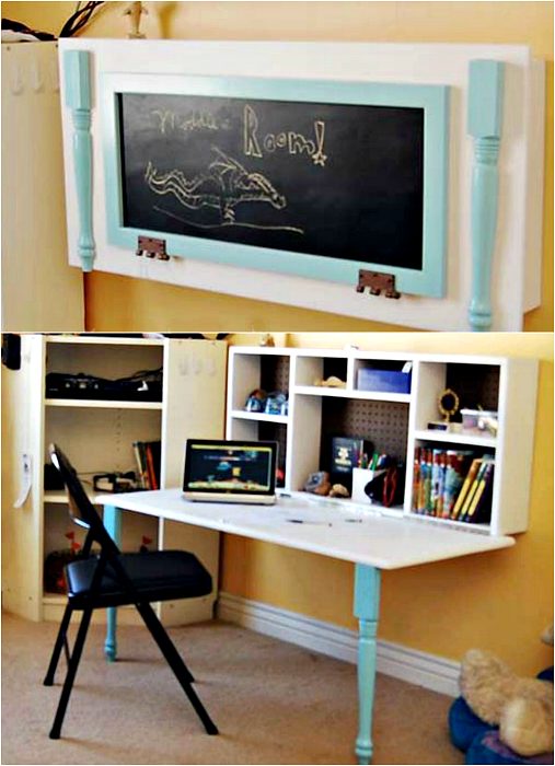 Оригинальная конструкция, совмещающая в себе откидной стол и систему хранения, станет замечательным решением для обустройства уголка для детского творчества.