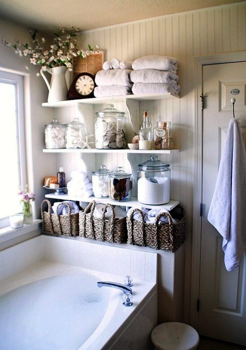 Несколько узких полочек над ванной позволят разместить множество необходимых вещей и значительно оптимизировать небольшое пространство. К тому же такая система хранения сделает ванную комнату очаровательной и уютной.