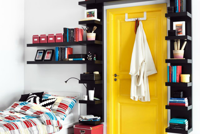 Компактные черные полки вокруг яркого дверного полотна спальни позволят грамотно использовать пространство небольшой комнаты и разместить массу полезных вещей. Кроме того, такая система хранения станет стильным украшением всего пространства.
