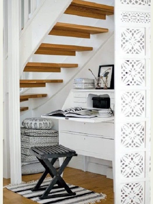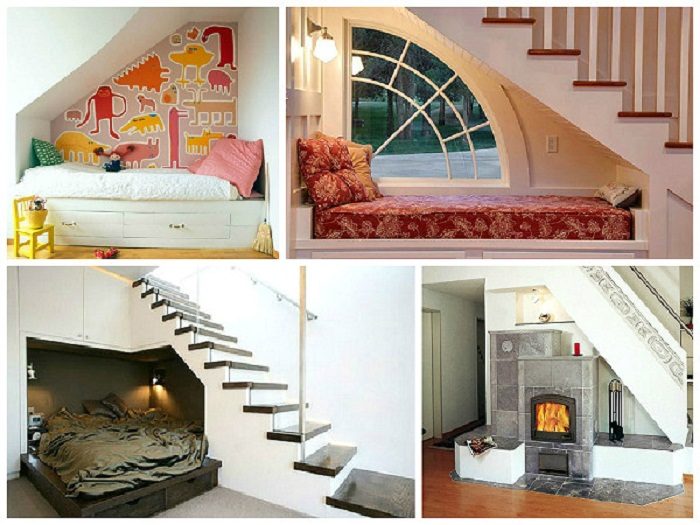 Удачное решение разместить местечко для отдыха под ступенями, что станет просто отличным вариантом декора.
