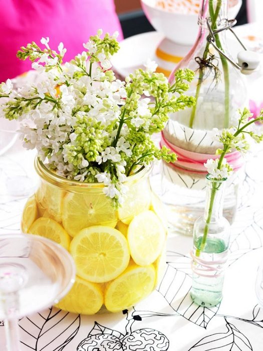 Простой, но в тоже время очень яркий вариант оформления вазы при помощи лимонного декора, что станет просто находкой.