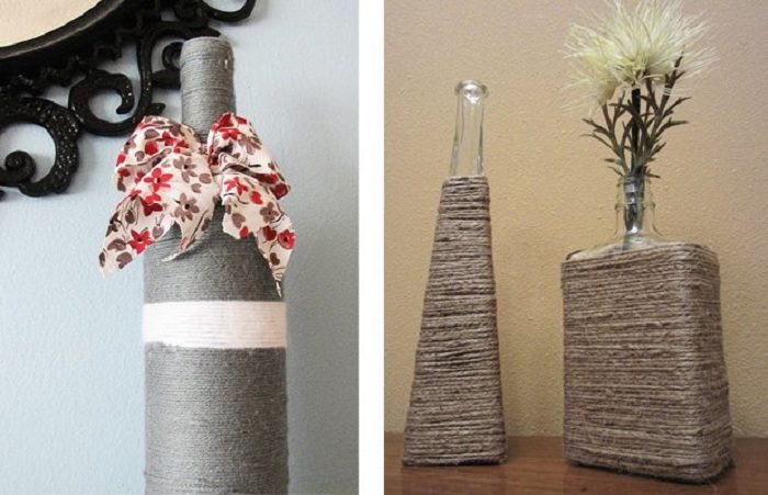 Хорошенькая идея украсить обычные бутылки при помощи нити, что станет просто открытием и позволит создать оригинальные вазы.
