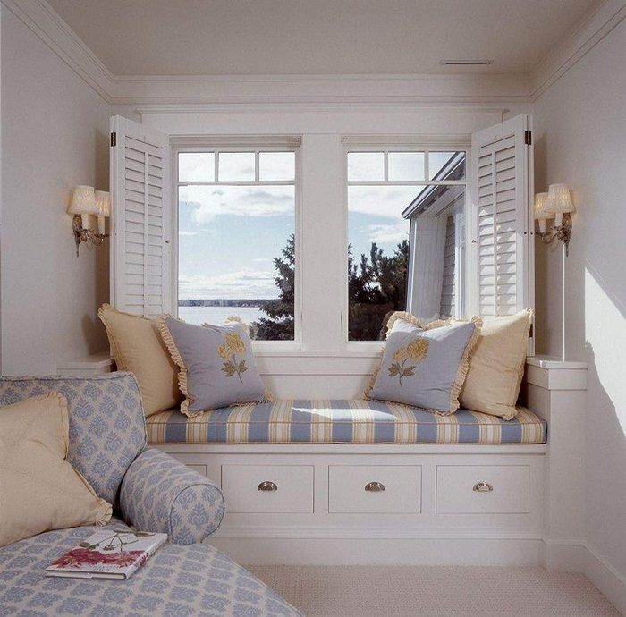 Один из самых лучших вариантов оформления пространства в комнате с помощью размещения в ней диванчика на окне.