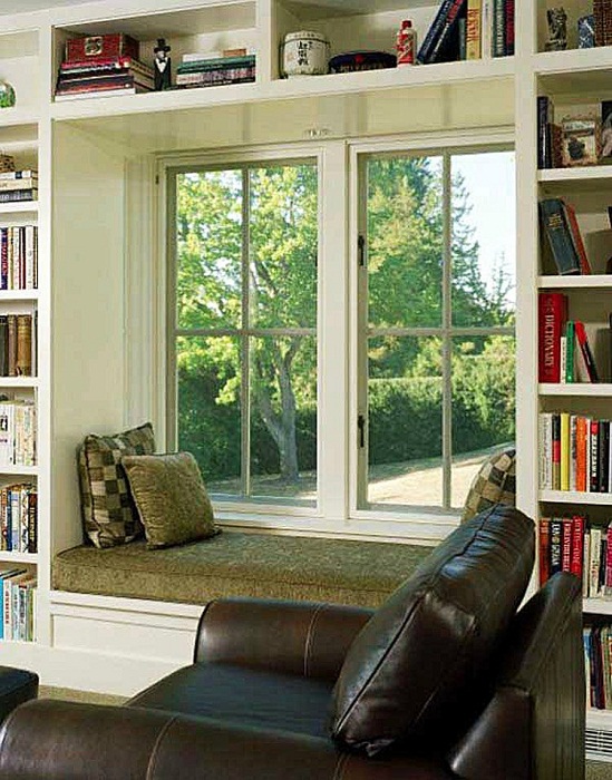 Прекрасное оформление комнаты с чудным диванчиком, который расположился прям на подоконнике.