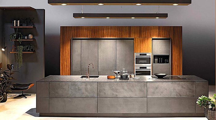 Кухня ALNOCERO Concrett.Компания ALNOCERO Concretto, победитель 2016 года немецкой премии «Победитель» в номинации «Превосходный продукт. Кухня» заметно выделялась среди конкурентов смелостью в использовании материалов. Композитная смесь, имитирующая бетонную фактуру, стала настоящим прорывом в дизайне мебели для кухни. Кроме экстравагантного внешнего вида, ее преимущества – устойчивость к высоким температурам и механическим повреждениям.