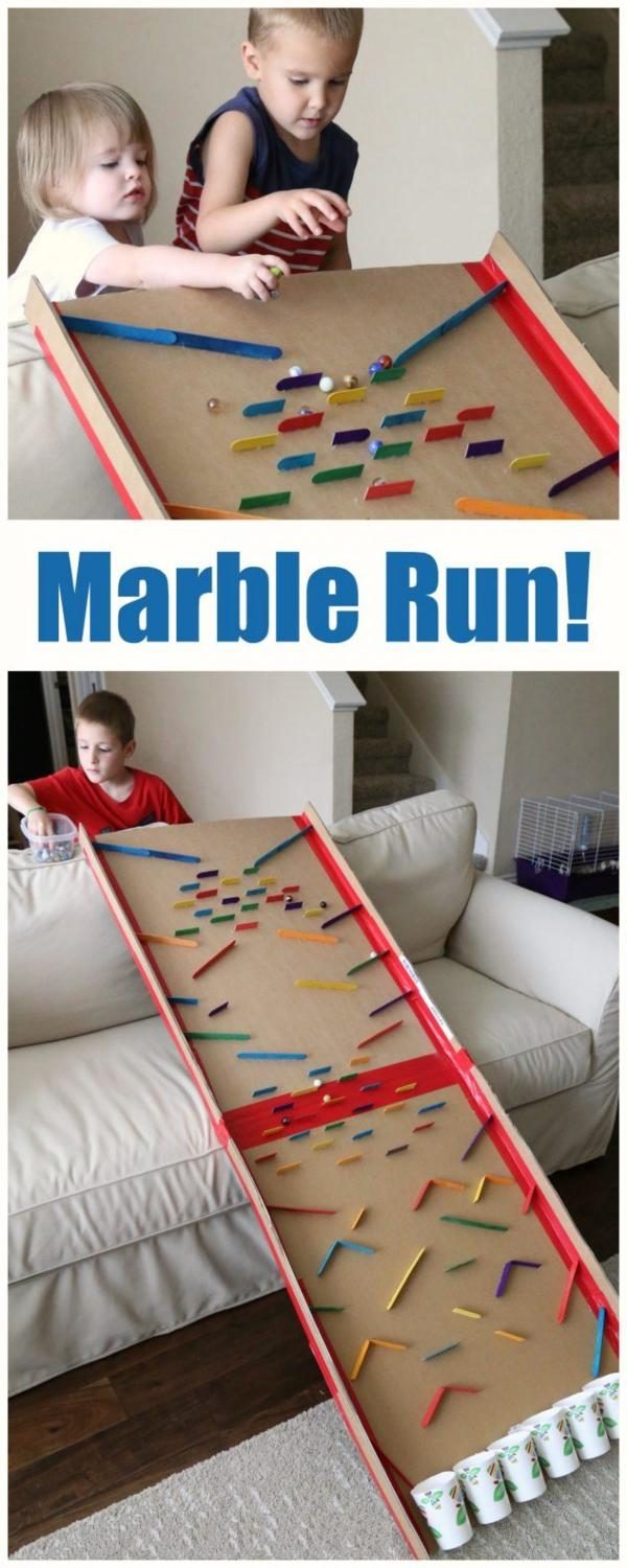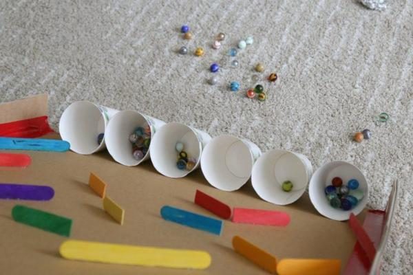 Картонная коробка, бумажные стаканчики, палочки, клей, мраморные шарики – и вот у вас готова отличная игрушка!
