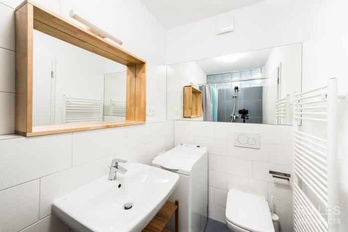 В небольшом санузле также очень лаконично распределили пространство. Вместо громоздкой ванны оборудовали душевую зону, её выделили серым цветом, остальное же пространство выложили белоснежной плиткой, что позволило зрительно сделать комнату немного больше и просторнее. Ещё один секрет этой маленькой комнаты – расположение в ней сразу двух зеркал. Одно из них оснащено удобной полкой, а другое установили специально для визуального преображения пространства.