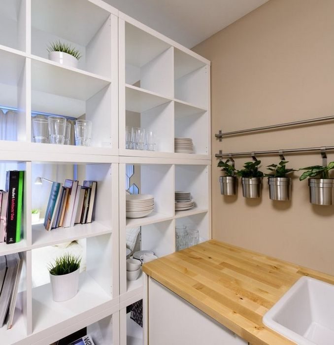 Кухню сделали угловой, при этом, задействовав одну из стен полностью для систем хранения, вторую же оставив свободной, что положительно повлияло на интерьер в визуальном плане. Напротив кухни расположилась небольшая зона столовой, состоящая из нескольких табуретов и компактного стола на одной ножке.