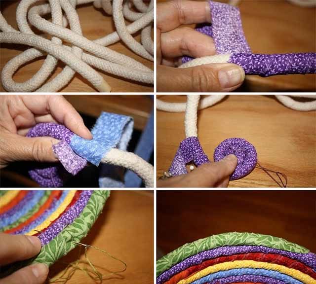 Технология изготовления такого коврика проста: старые свитера нарезаются на полоски и сшиваются в длинную ленту. Эту ленту мы сшиваем в узкую полосу, выворачиваем ее налицо и продеваем в нее толстую веревку. Сворачиваем полученную длинную «колбаску» в круг и сшиваем кольца между собой. Такой же коврик можно сделать не только из остатков трикотажа, но и из кусочков любой ткани: