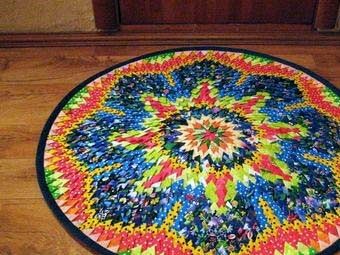Традиционные круглые коврики делали из старых ненужных вещей, нарезали их на квадратики и треугольничками заполняли-сшивали коврик по кругу.