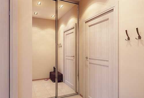 Неожиданно просторный коридор для этой маленькой квартиры зрительно увеличивает вместительный шкаф-купе с зеркальными дверцами.