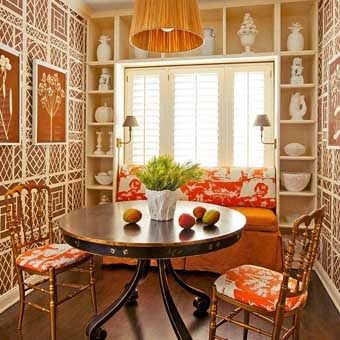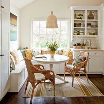 Это обеденное место на кухне сочетает в себе практичность и уют. Ящики под скамейкой вместят кухонную утварь, а кухонные шкафы по бокам создают эффект защищенности и уединения.