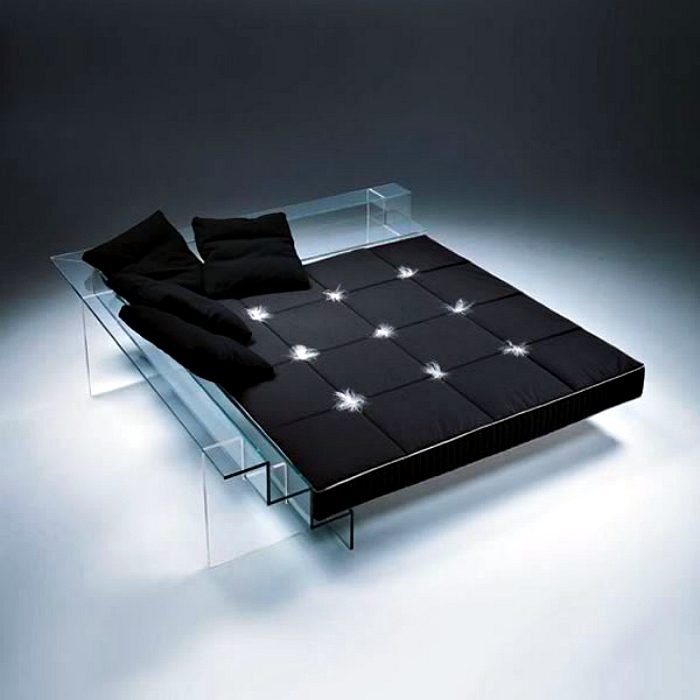 Стеклянный каркас этой роскошной кровати делает ее практически невидимой. Такая кровать прекрасно впишется в интерьер в стиле хай-тек или модерн.