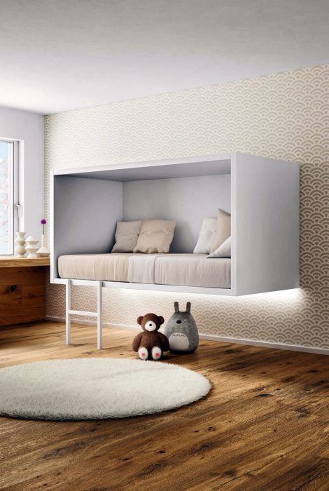 Компактная подвесная кровать, похожая на большую полку с лесенкой, прекрасно впишется в интерьер небольшой детской.