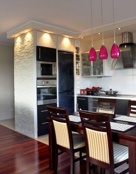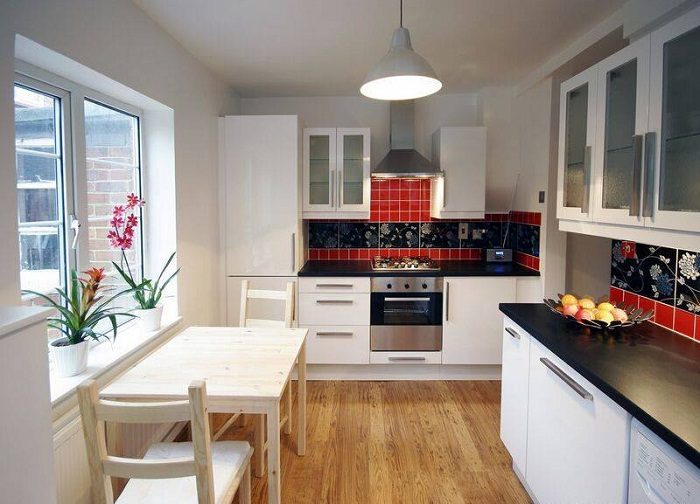 Удачный вариант создать яркий интерьер на кухне, что быстро преобразит комнату такого типа.