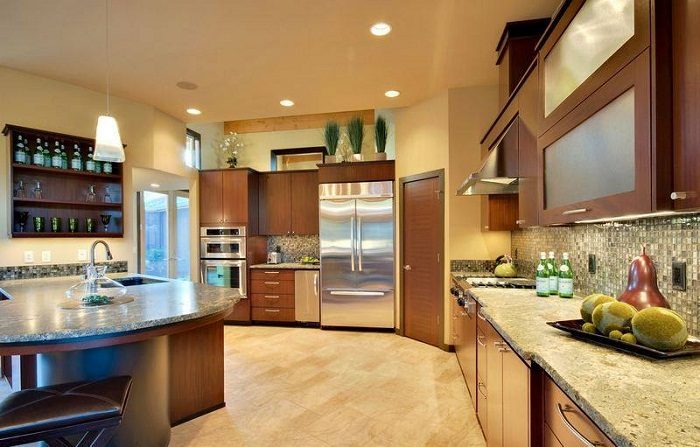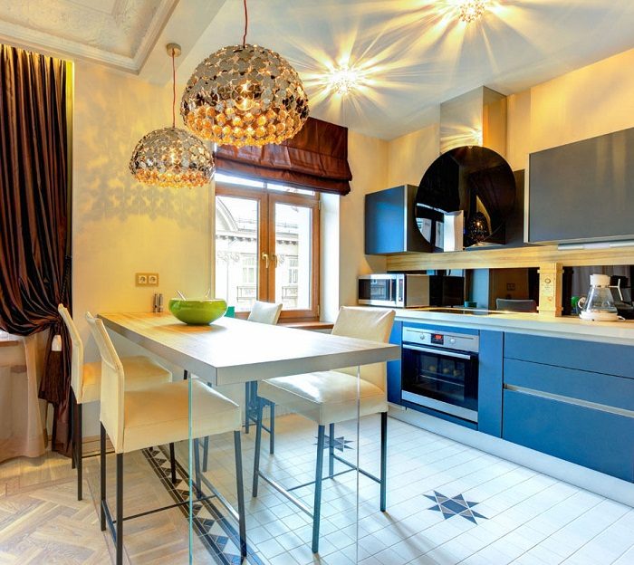 Оформить интерьер кухни в современных тенденциях, возможно с помощью интересного освещения.