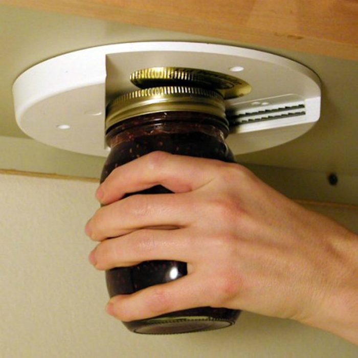 Удобная в использовании открывалка для банок, которую можно закрепить под рабочей поверхностью или прикрутить к низу любого навесного шкафчика.