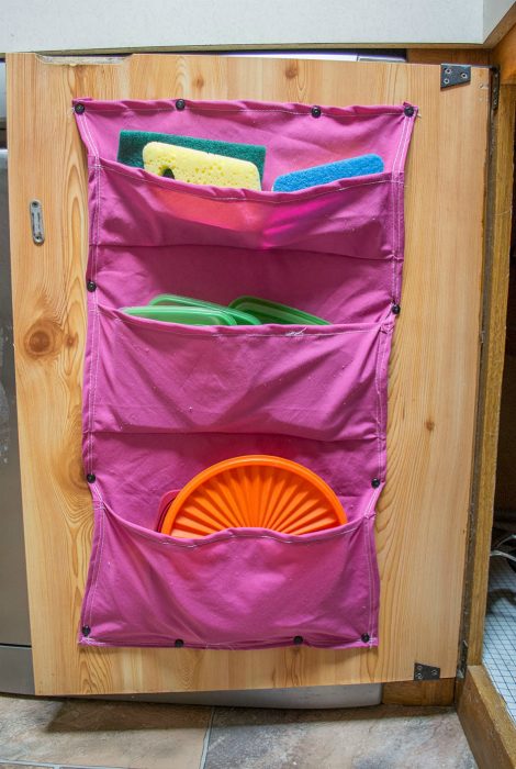 Из ненужных футболок, старых наволочек или куска материи можно сделать практичный органайзер для хранения резиновых перчаток, губок, тряпок, крышек и прочих мелочей. Смастерить такой органайзер сможет даже человек с минимальными навыками шитья, а закрепить его лучше всего на внутренней части двери кухонного шкафчика с помощью канцелярских кнопок.