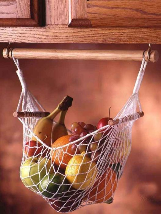 Внизу кухонного шкафчика можно повесить небольшой самодельный гамак для эффектного и эргономичного хранения овощей и фруктов.