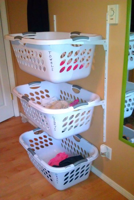 Из нескольких кронштейнов и пластиковых корзин можно смастерить удобный стеллаж для хранения грязного белья в ванной или игрушек в детской.