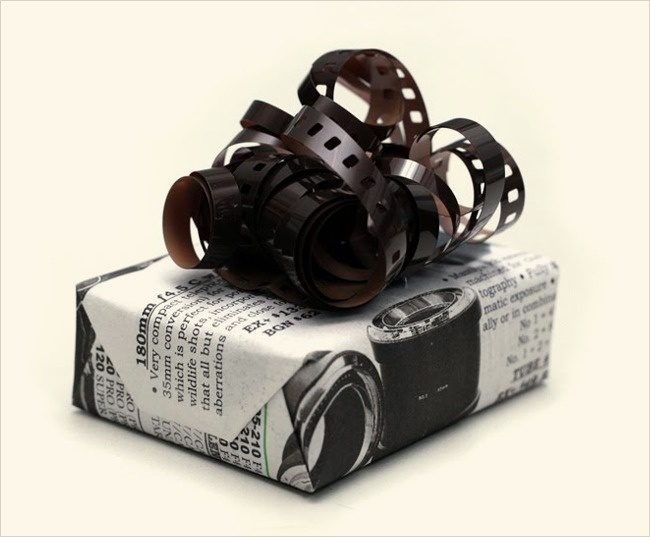 © 4.bp.blogspot Такой подарок оценят любители кинематографа и фотографы. Посмотрите, как гармонично выглядит обычная газета в роли оберточной бумаги.