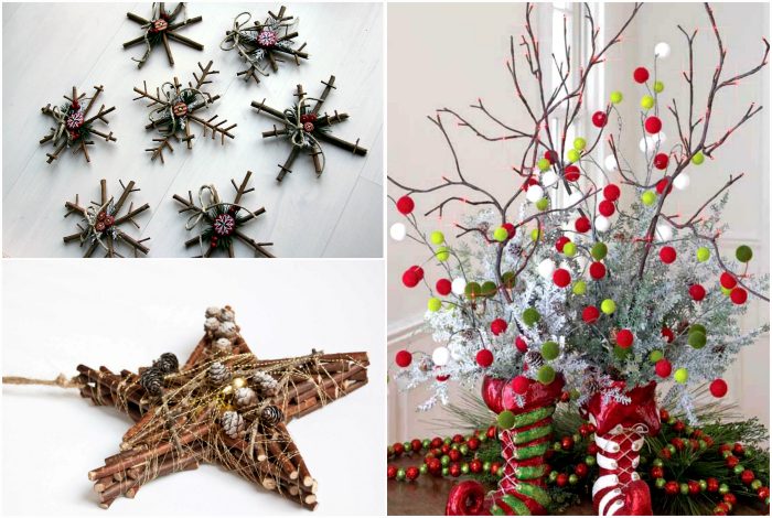 Ветки — это доступный и чудесный материал для творчества, который идеально подойдёт для украшения интерьера в преддверии 2017 года. Из сухих веток, мешковины, веревок и пуговиц можно смастерить уникальные игрушки в виде звездочек и снежинок, а букет из нескольких веток, украшенных блестящими елочными шарами, станет стильной альтернативой елки.
