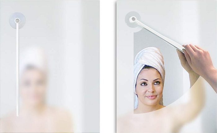 Прибор, позволяющий избавиться от разводов на зеркале.Как правило, после горячего душа зеркало запотевает. Приходится стирать конденсат ладонью, что неизменно приводит к неопрятным разводам. Решение проблемы довольно простое. Этот стеклоочиститель крепится к зеркалу присоской и в нужный момент срабатывает как дворник на лобовом стекле машины.