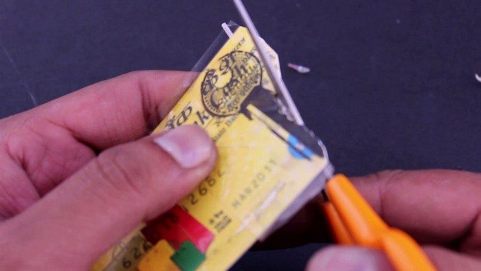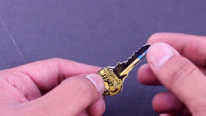 Наклейте скотч с отпечатком на пластиковую карточку. Используйте его, как трафарет, чтобы вырезать копию ключа из пластика. И отпечаток, и ваше следование контуру должны быть максимально правильными. Иначе ничего не получится.