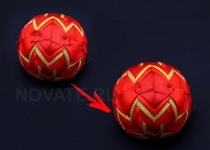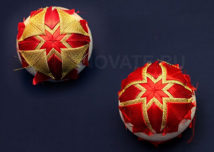 Шарики в этой технике можно делать большими и маленькими, с парчовыми лентами и без них, разных цветов и фактур.