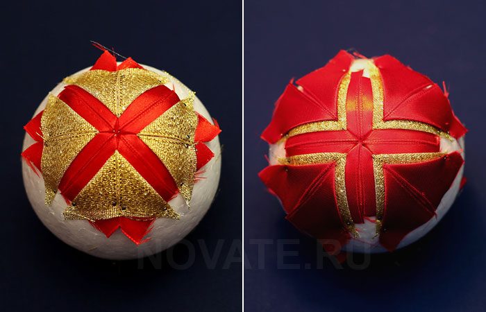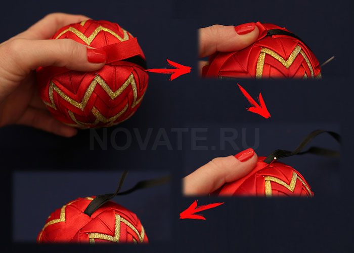 Перед началом декорирования экватора нам необходимо убрать все торчащие кончики и ниточки от ленты. Их можно срезать или аккуратно подплавить зажигалкой.Как сделать петельку для новогоднего шарика