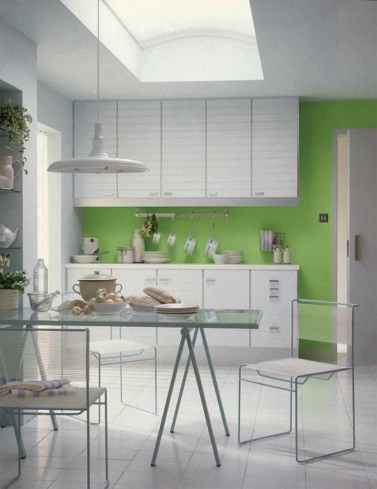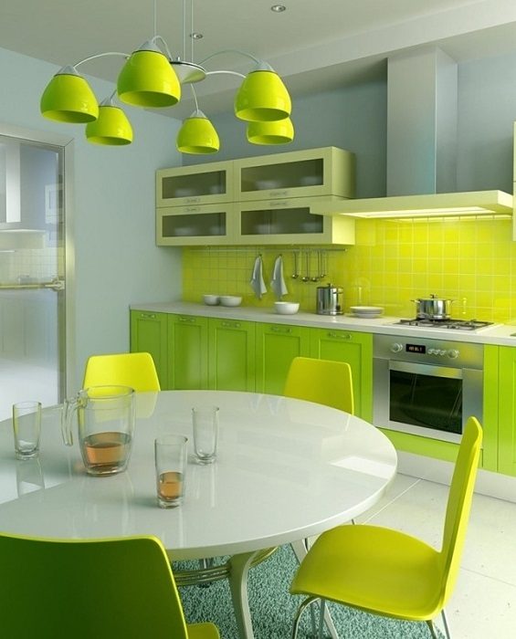 Оформление кухни в ярко-салатовом цвете — всегда хорошее настроение.