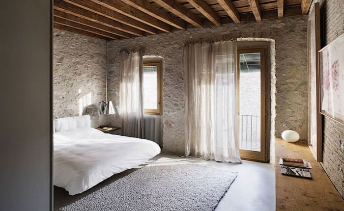 Деревянные балки на потолке из аналогичного материала сделают уютным любой интерьер. Особенно гармонично подобное оформление будет выглядеть в сочетании с натуральным камнем.